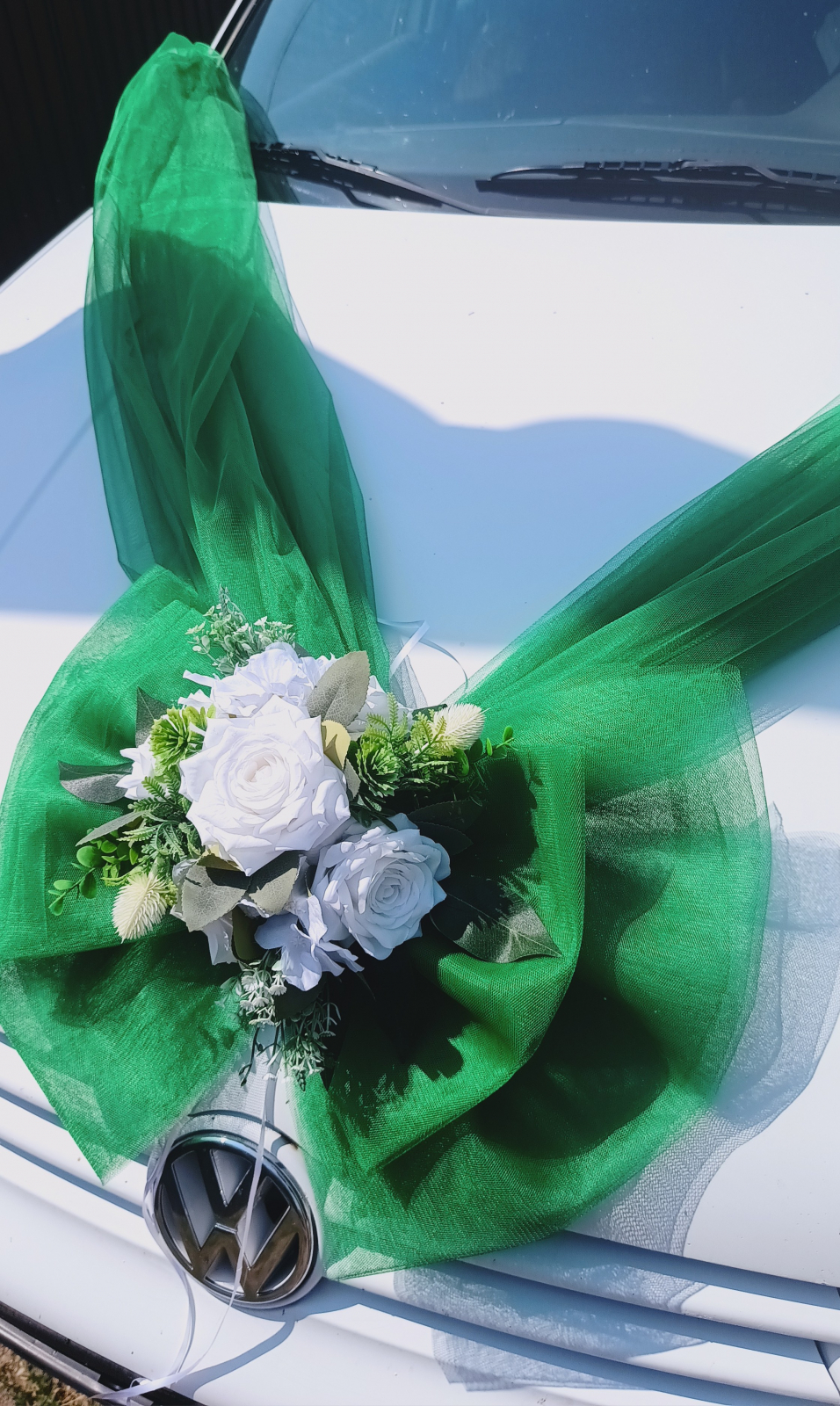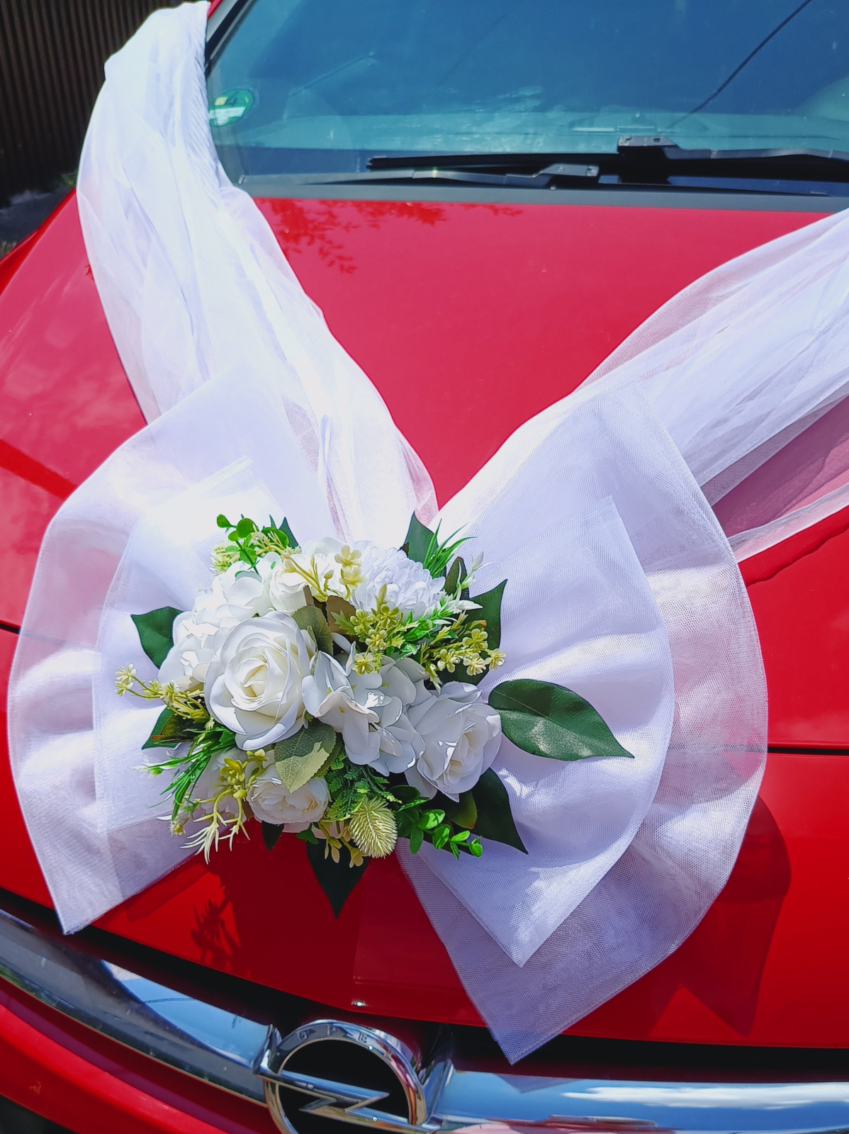 Aranjament pentru masina, format din funda dubla mare, si buchet de flori artificiale.