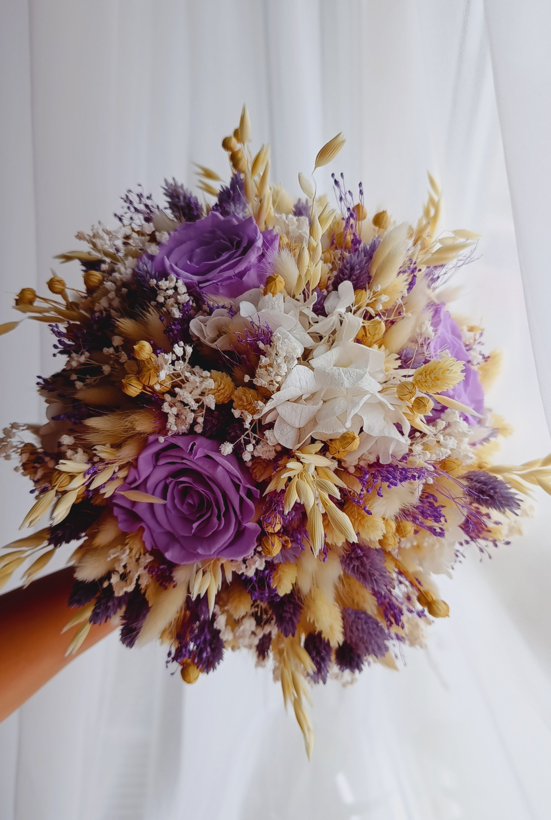Buchet de mireasa creat in intregime cu flori criogenate si plante uscate.