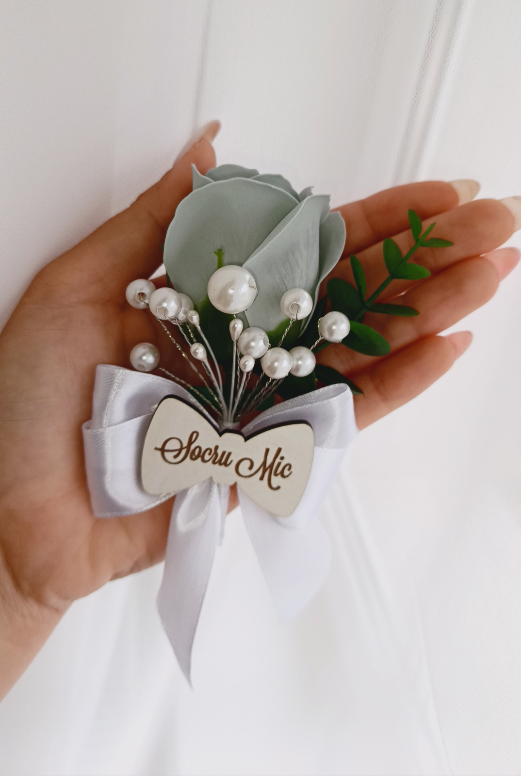 Floare de pus in piept cu floare artificială sau trandafir din săpun și perle. Personalizată cu plăcută din lemn, se poate scrie orice doriți pe plăcută. Modele disponibile placute: fluture, papion, inima.