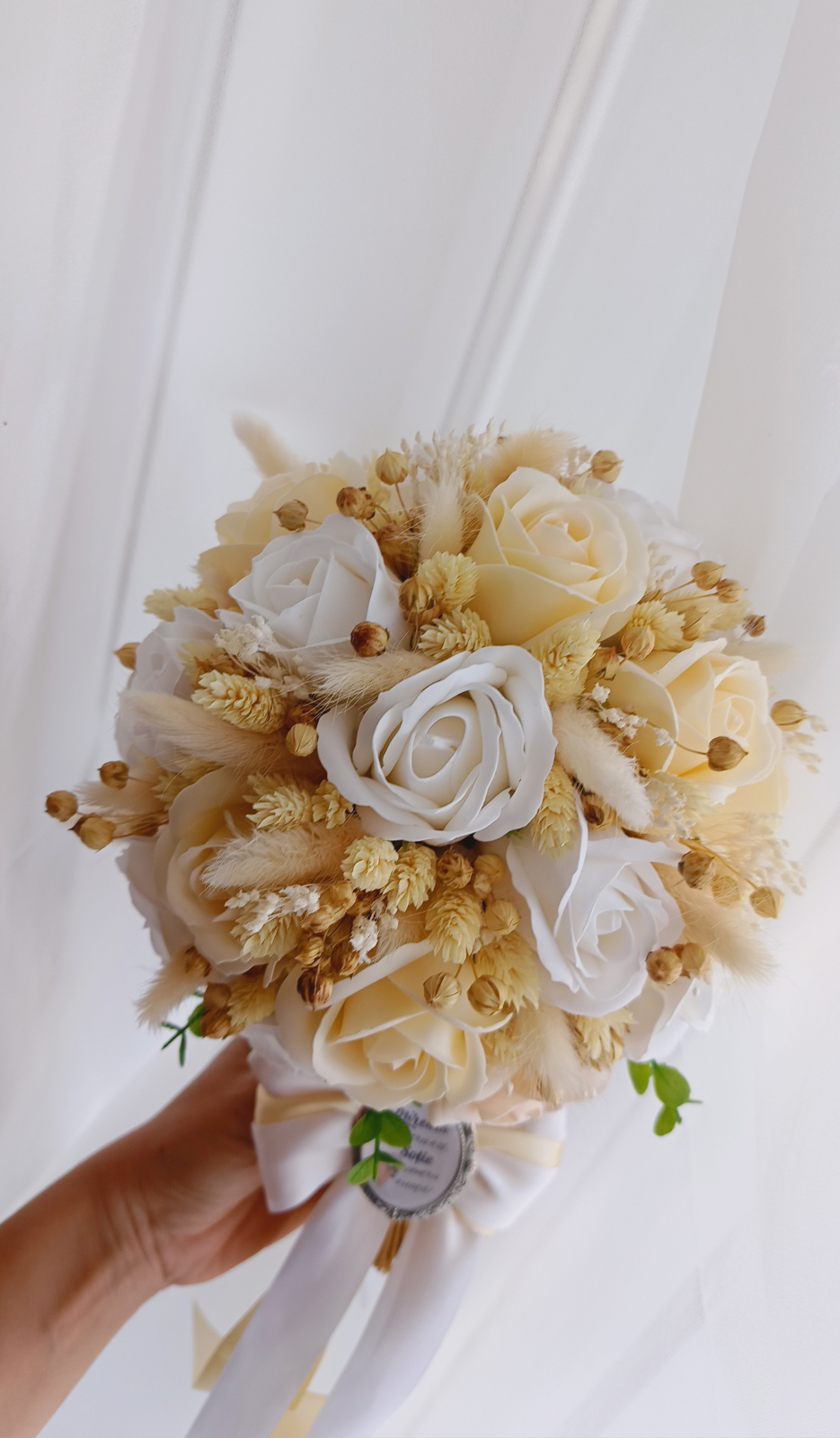 Set nunta 2 lumânări și buchet mireasa White and Cream realizate cu lumânări fagure, trandafiri din săpun și plante uscate.
